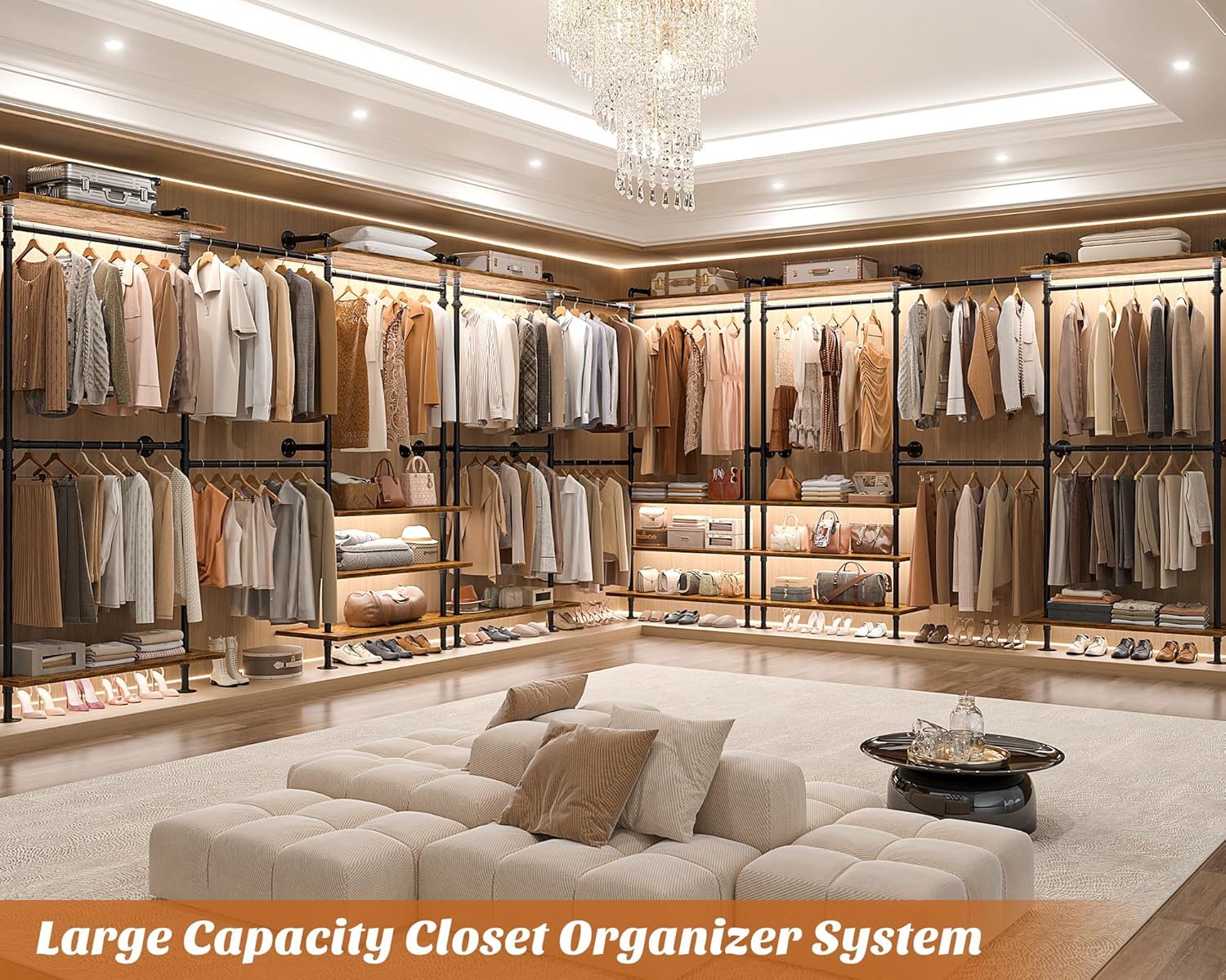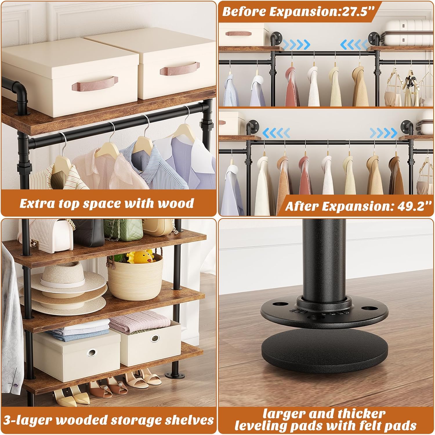 Aheaplus Industrial Pipe Clothing Rack, Expandable Garment Rack, Closet System with Wood Shelves for Hanging,Wall Mounted Clothing Rack, Adjustable Storage Wardrobe for Walk in Closets, Rustic Brown
