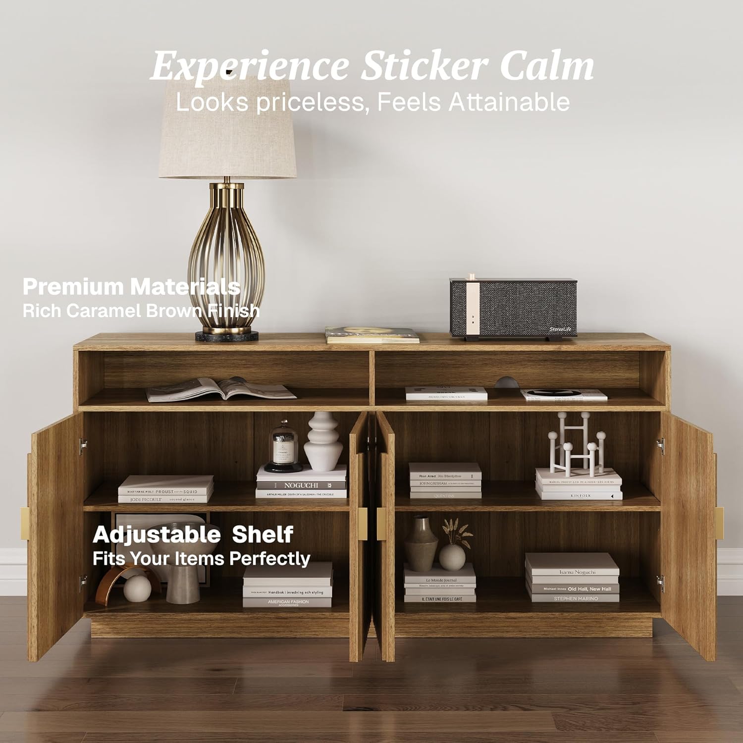 BELLEZE 65 Inch Fluted TV Stand, Mid Century Modern Entertainment Center with Storage Cabinets & Open Shelves, Media Console TV Cabinet with Adjustable Shelves for Living Room, Caramel Brown
