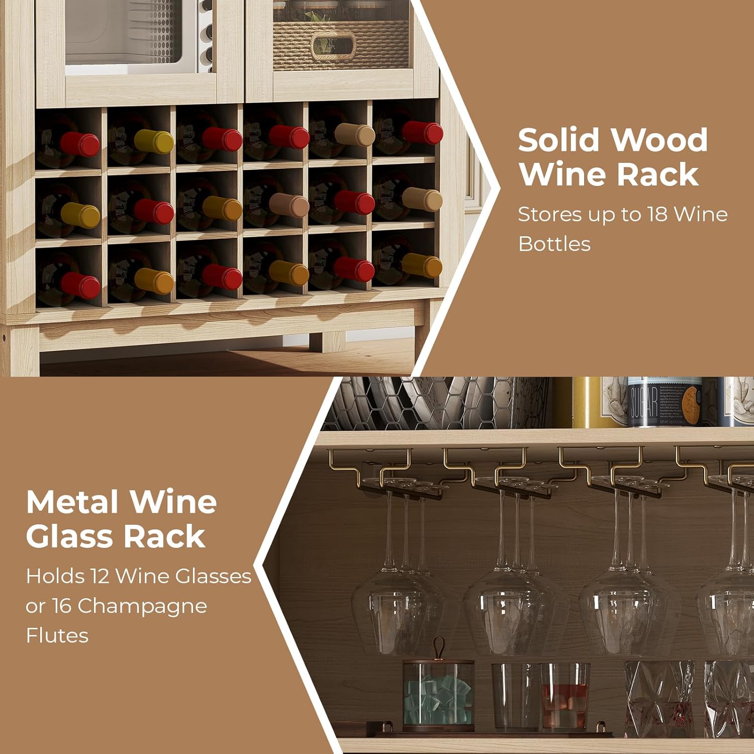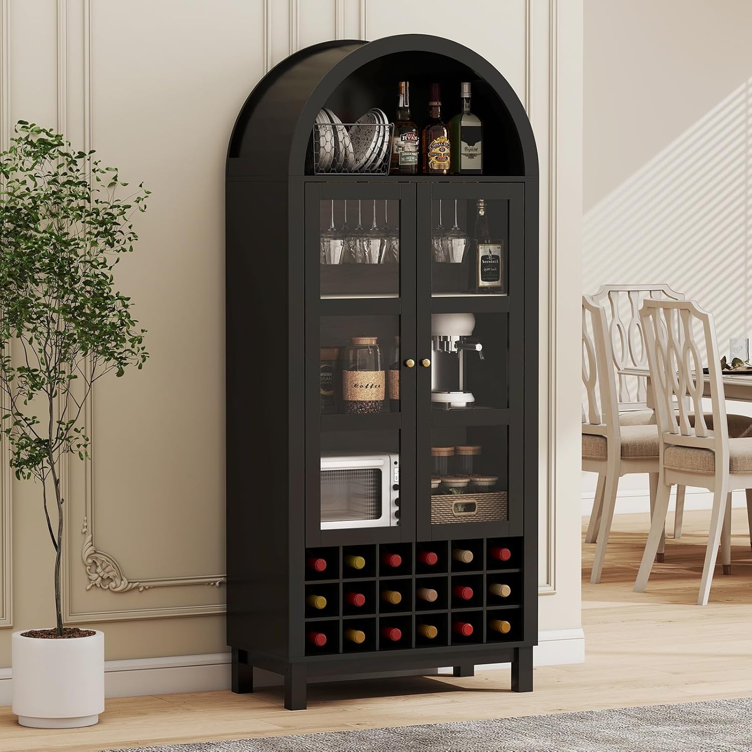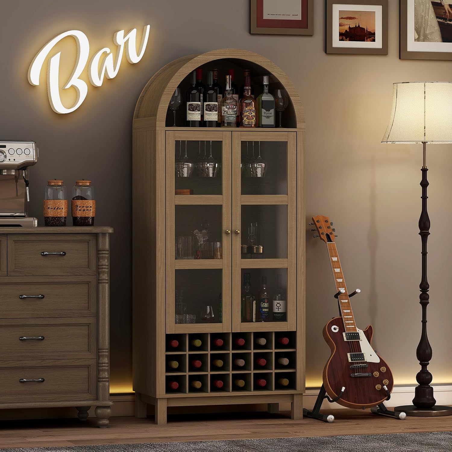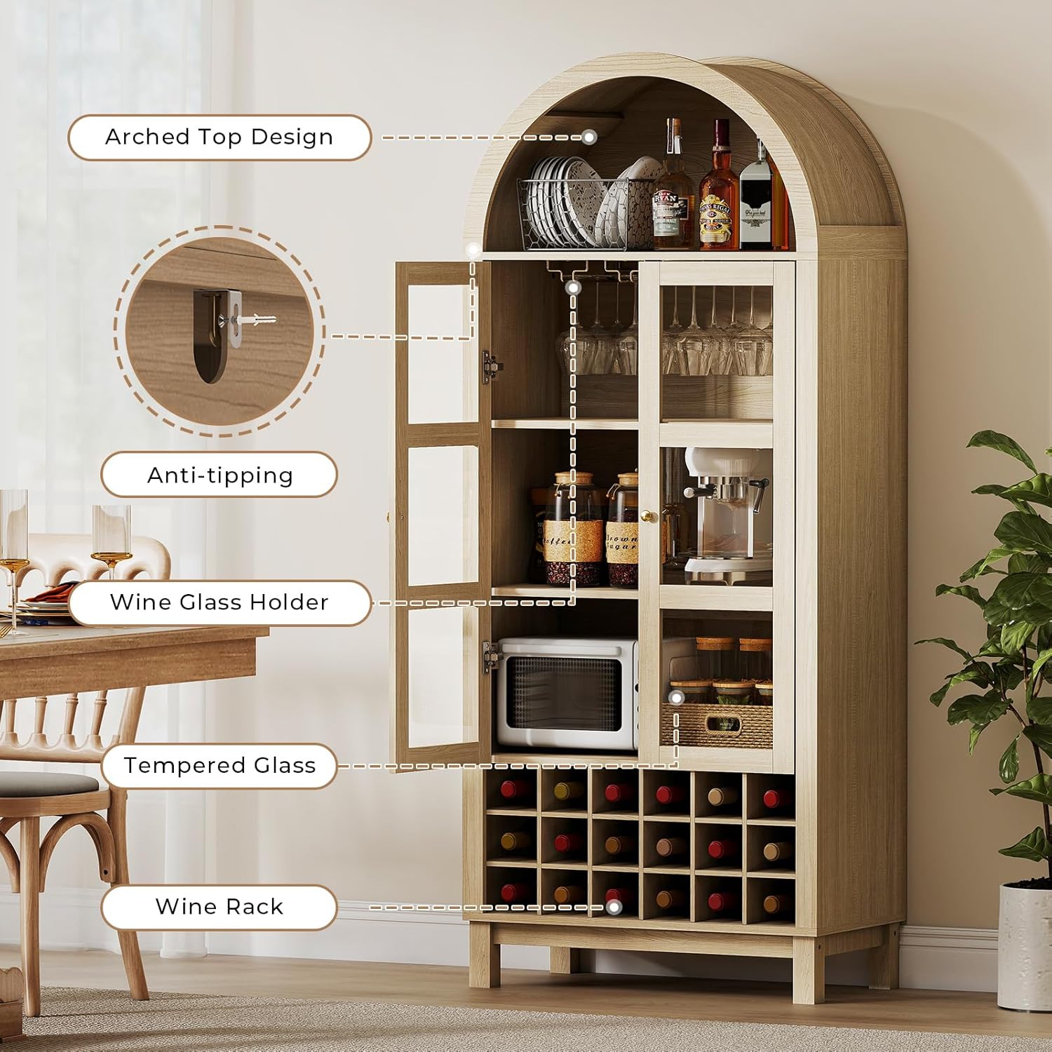 EAG 72" Tall Arched Wine Cabinet with Glass Door, Rustic Coffee Bar Storage Cabinet with Wine Rack, Storage Shelves Large Liquor Cabinet for Dining Room, Kitchen Oak