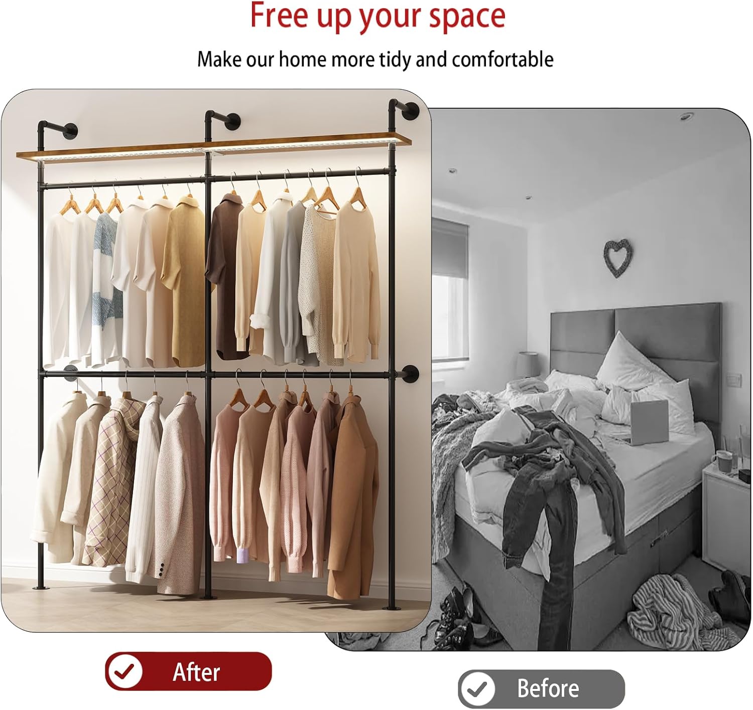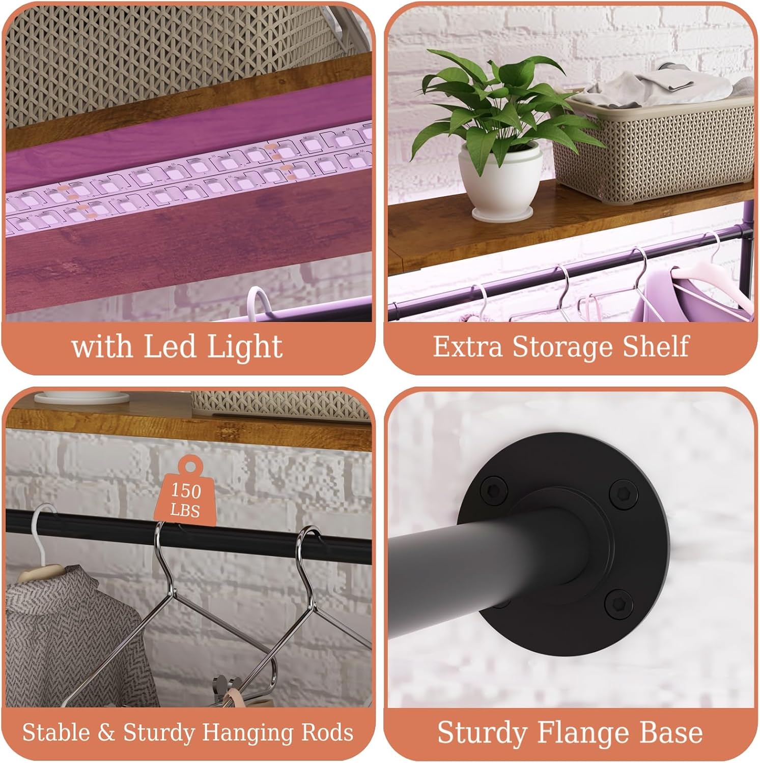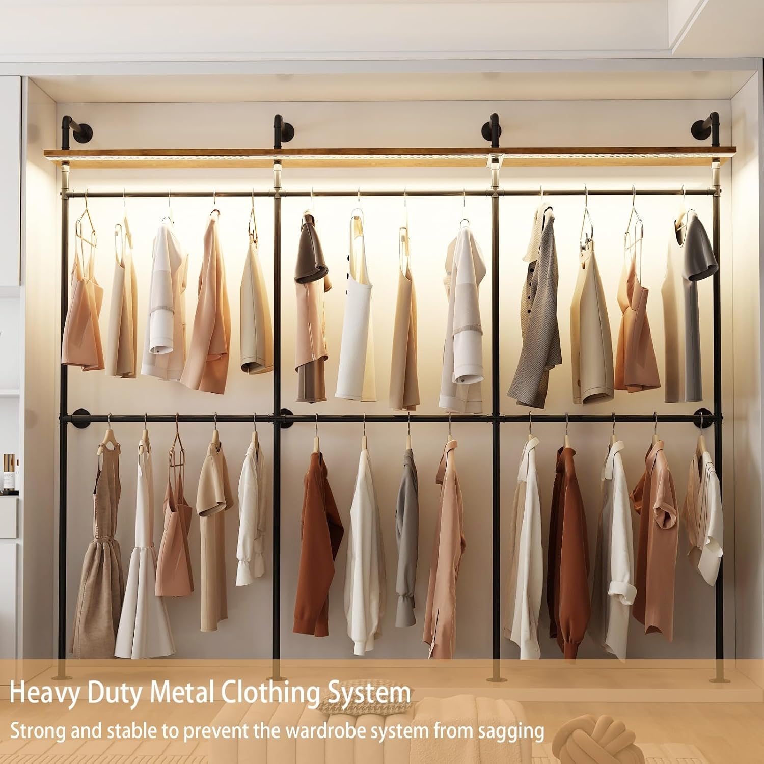 Industrial Pipe Clothes Racks with LED Lights& Shelves, 118" Wall Mounted Clothing Rack for Hanging Clothes, Heavy Duty Industrial Pipe Shelving for Walk-in Closet, Black