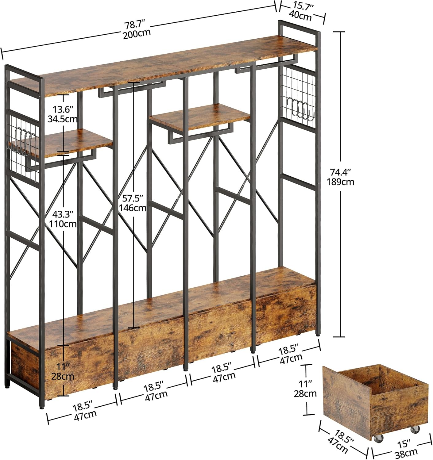 IRONCK Garment Racks and Storage Shelves, Heavy Duty Clothes Rack with 4 Wooden Drawers and Hanging Rods, Freestanding Closet Wardrobe Rack, Vintage Brown