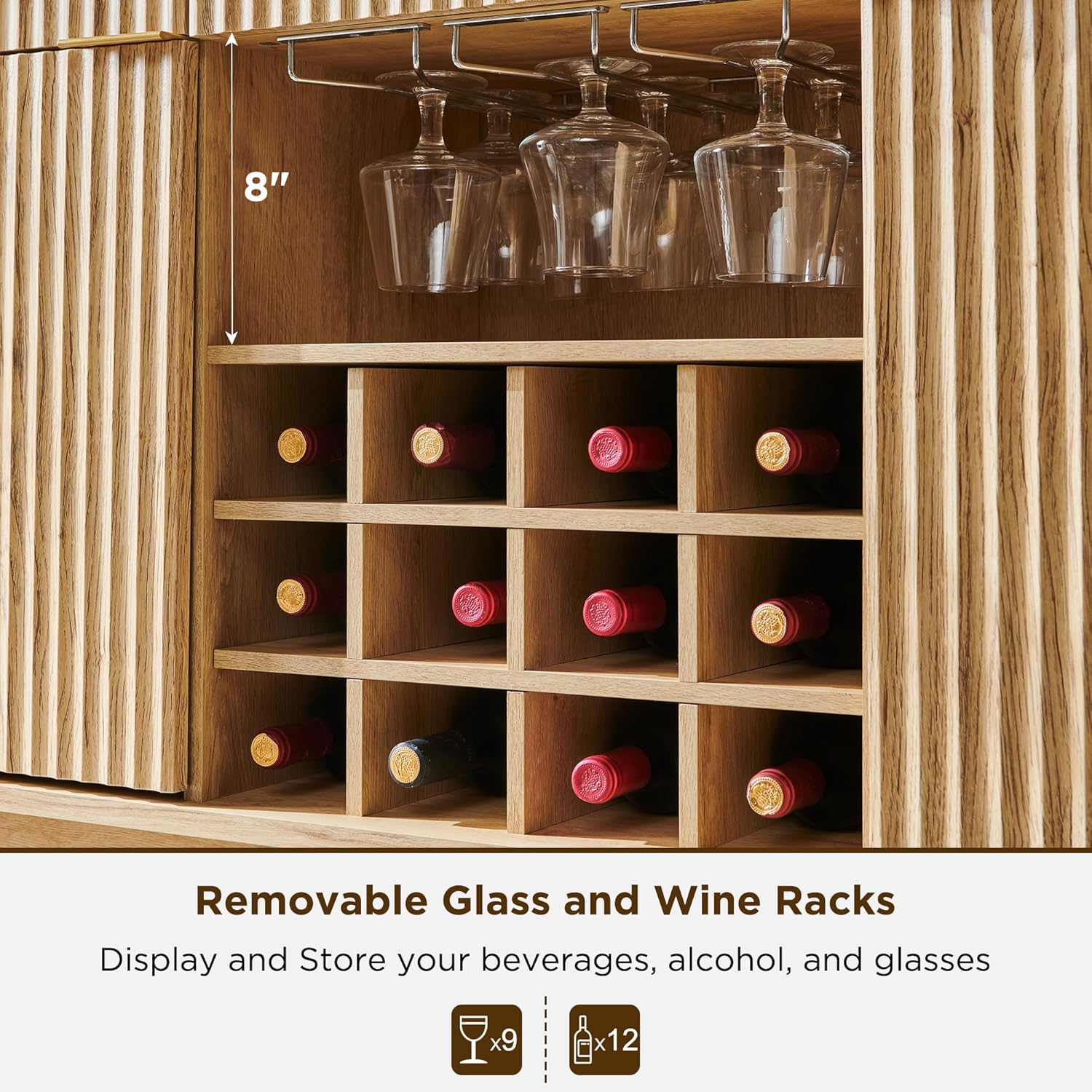OKD 60" Fluted Buffet Cabinet with Storage - 3 Drawers and 2 Doors, Mordern Wine & Coffee Bar Cabinet with Wine and Glass Racks, Sideboard with Adjustable Shelves for Kitchen, Dining Room,Natural Oak