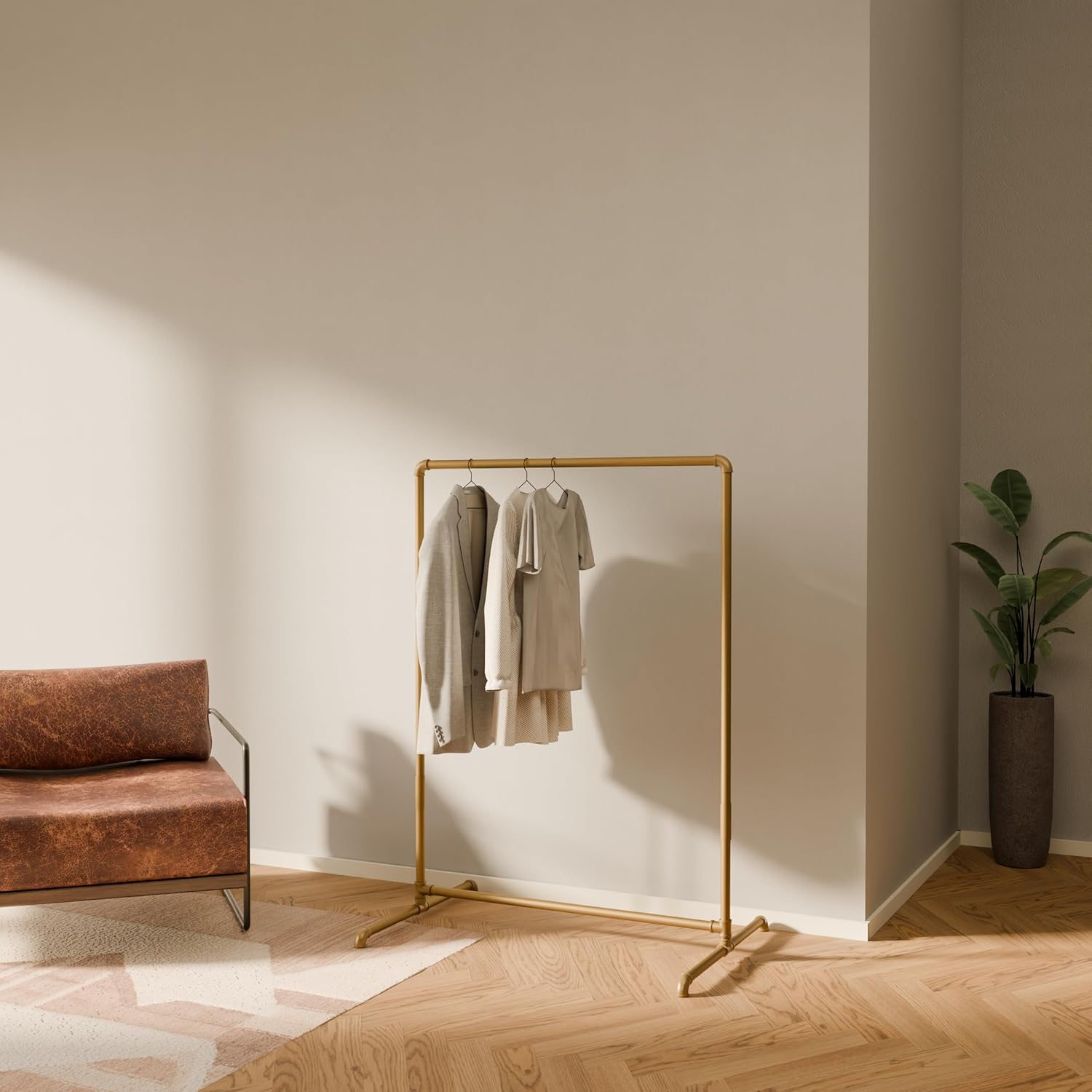 pamo Gold Clothing Rack – 59.84" W x 76.38" H – Industrial Pipe Metal Garment Organizer for Bedroom or Retail – Heavy-Duty Clothes Rack – Easy Assembly