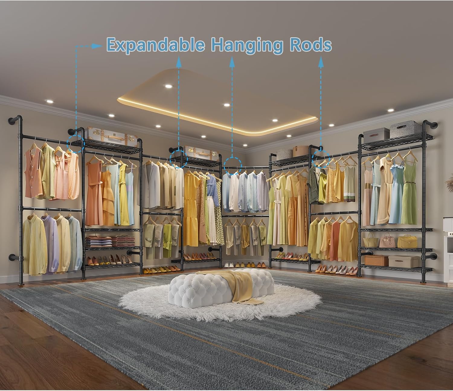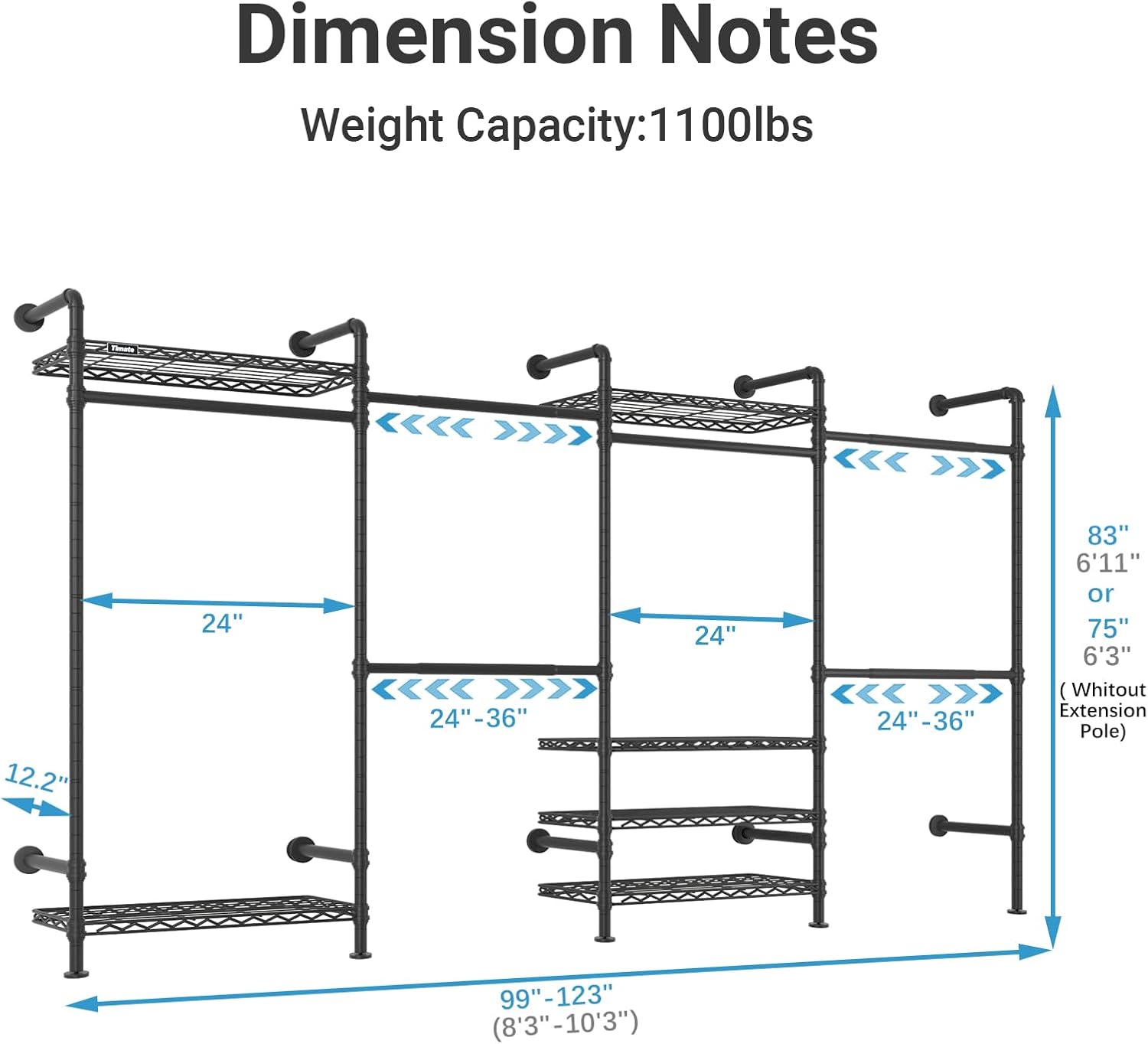 Timate F4 Wall Mounted Clothes Rack Industrial Pipe Clothing Rack for Hanging Clothes, Expandable Garment Rack Heavy Duty Wardrobe Closet Organizer and Storage, Black Adjustable Industrial Closet Kit